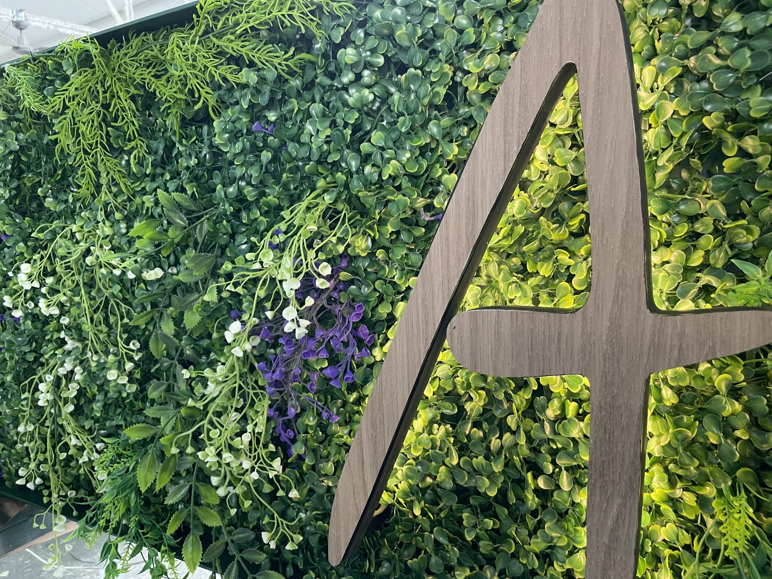 Cartelería luminosa con trasera de plantas artificiales montada con gran variedad y buen gusto.